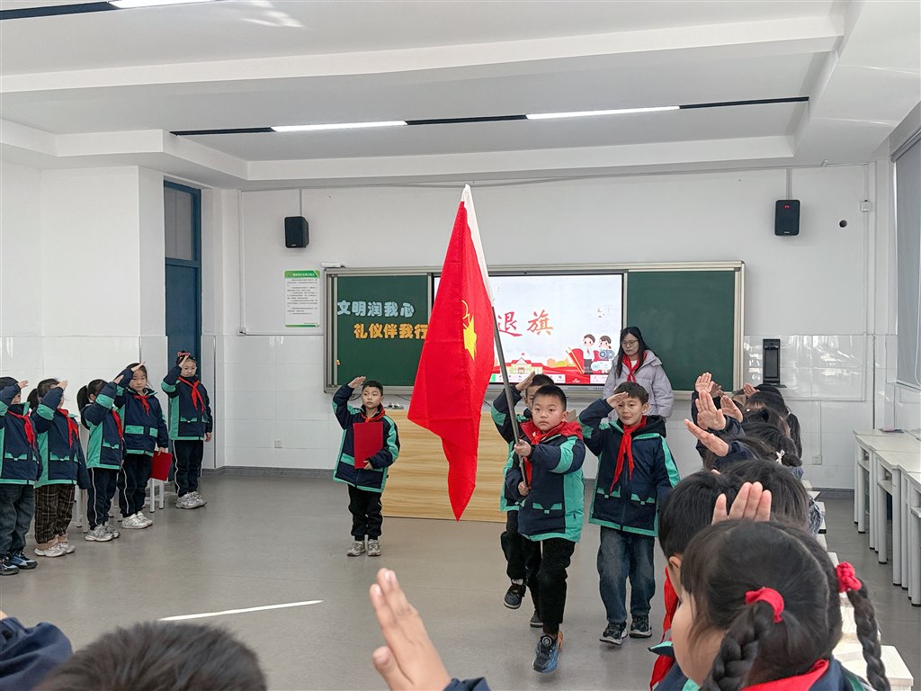 活动伊始,各小队有序汇报人数,在庄重的出旗、唱队歌仪式后,中队长点明活动主旨,鼓励队员们了解文明规章、践行文明礼仪。活动展演环节亮点纷呈、育人味浓:第一小队分享了手势舞《文明礼仪在校园》,例举校园不文明现象,鲜明传递“向不文明说不”的坚定态度,引导队员树立规则意识;第二小队的情景剧《上学》再现校园生活场景,引发队员对文明礼仪、校园安全的深入思考引发队员对“如何在日常交往中践行美德”的深入思考,强化了“文明无小事,细节见修养”的认知;第三小队精心搜集小学生行为规范相关知识并分享专题视频,结合《中小学生守则》解读文明内涵,让队员们明确“言行有度、举止有方”的具体要求;最后,全体队员通过一首《文明礼仪歌》文明理念深深记牢。活动尾声,辅导员全面总结活动成效,寄予队员殷切期望,带领全体队员庄严呼号,退旗仪式庄重有序,为本次主题队会画上圆满句号。